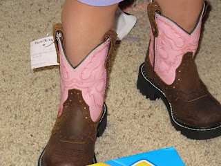 Even though she’s just two, Amelia has the personality to fill a room and the vocabulary to match, which, if you know us, is not surprising…we do not lack in conversation or pizazz! Anyway, she is turning into a farm girl, through and through, requesting cowboy boots for her one and only gift. The funny thing about this, is that I purchased her some fashion farm boots on a recent Target run, but on a trip to Farm King for work jeans, a coffee mug, and some hoses, Joe got to looking and found her some “real” cowboy boots: pink and brown in color and a true cowboy brand. It made me laugh, as we have purchased many cowboy-ish boots at Target for our little ones, but since Amelia’s new phrase is “Check cows, Daddy?” he figured it wasn’t too much to get her some real boots.