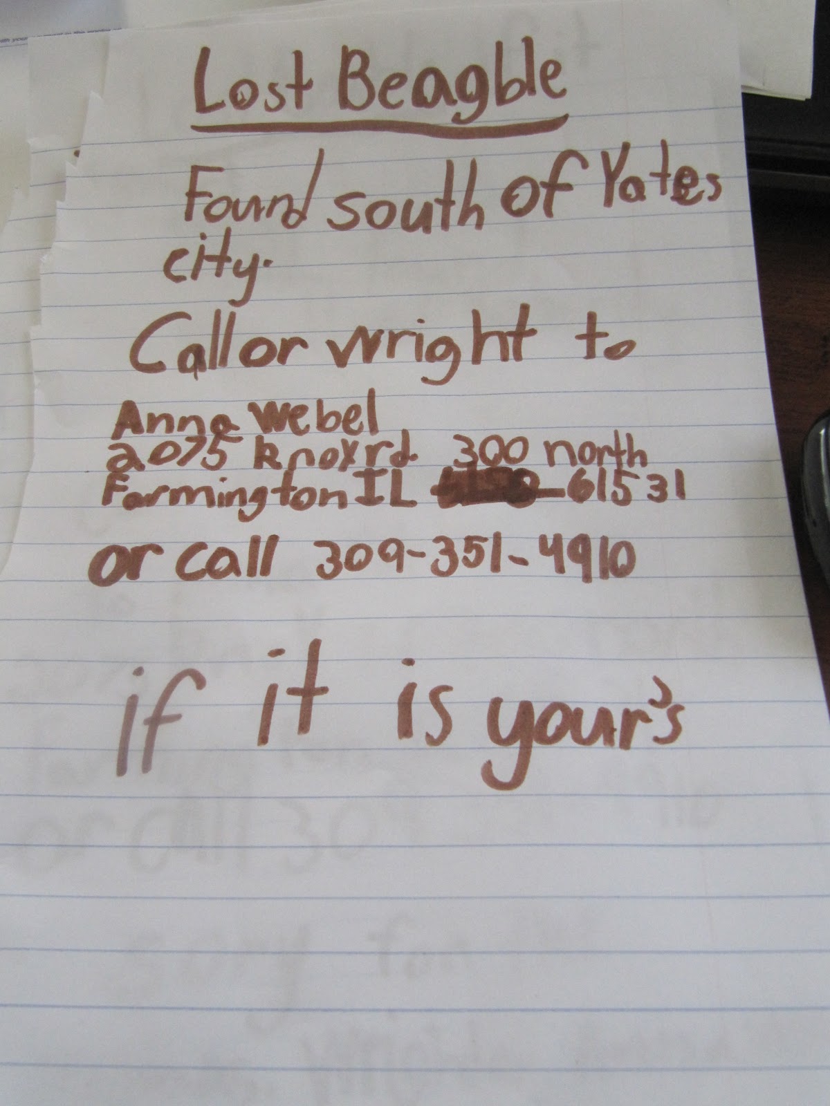 I’m also realistic on two accounts. This is a nice dog. There’s probably a lovely family who is missing their family pet. We’ve made a few fliers, thanks to our second grader.