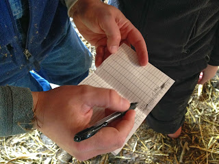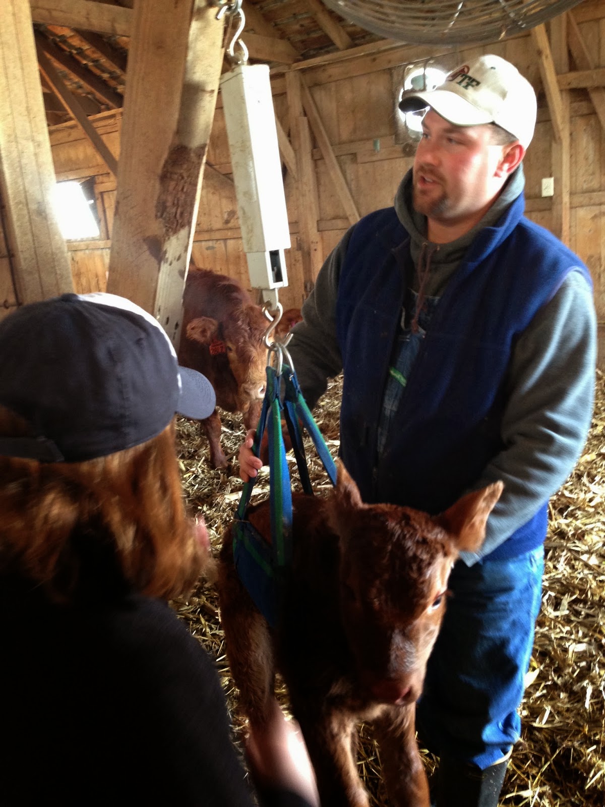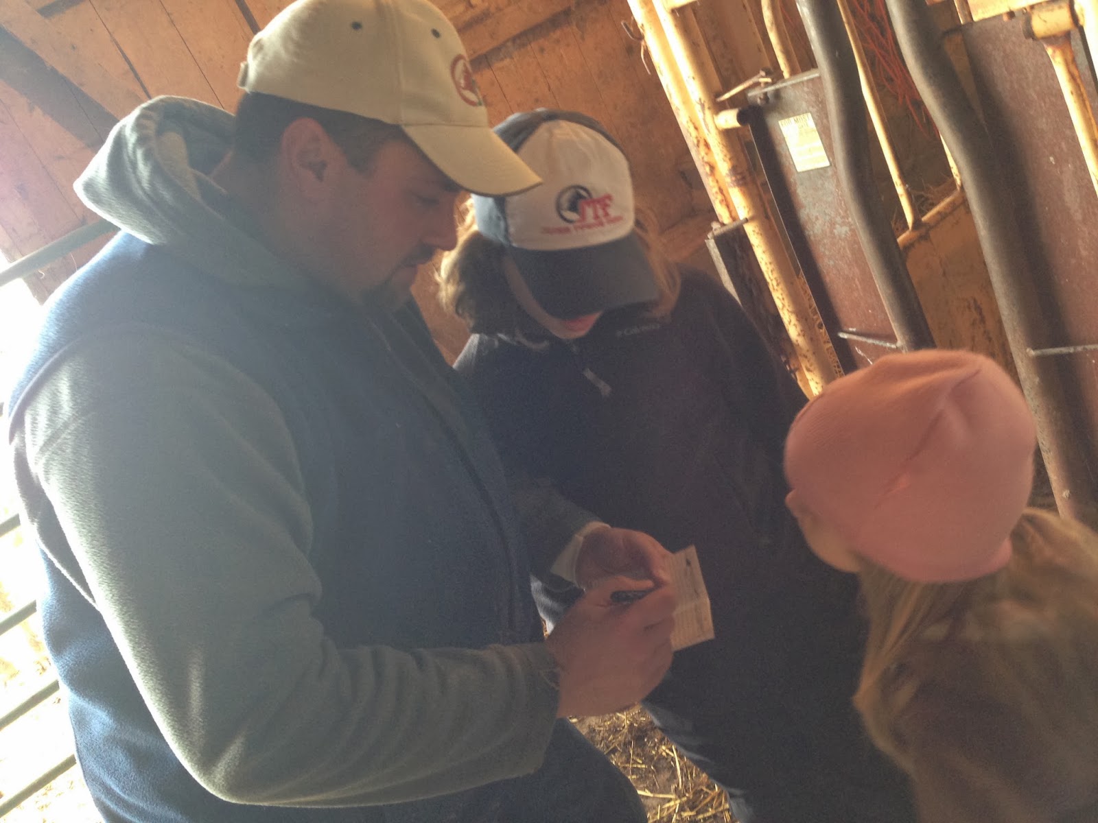 The most important part of collecting the information is recording it. Here, Anna is writing all of the information about the calf in her herd book. This information will then get registered with the American Simmental Association, via their online herdbook.