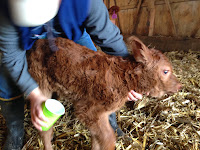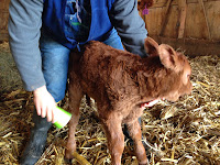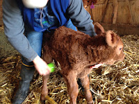 After a calf has nursed its mother the first time, it’s ready to be processed. After bringing the calf over the the processing area, we start off by dipping the calf’s navel in a solution of antiseptic solution and water. This kills any bacteria around the navel, which is a common entry point for infections. We also give a shot of vitamins B and Selenium. This gives the calf extra “pep” that gets them active during their first few hours of life.