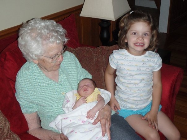 | Grandma holding Amelia just after she was born. She drove to our house that day at age 95! |